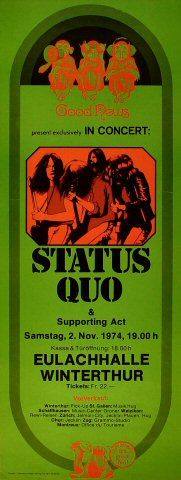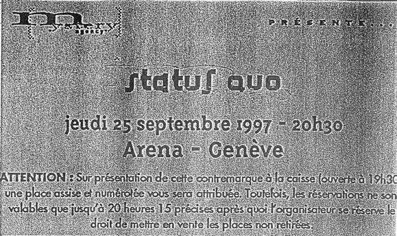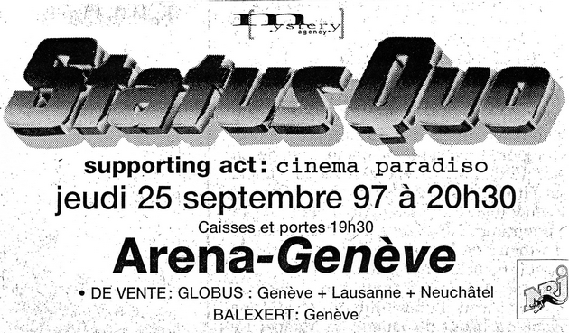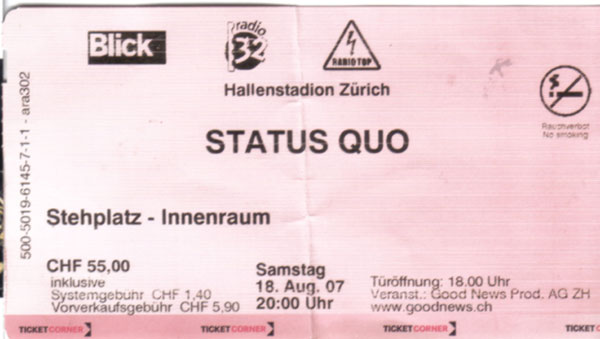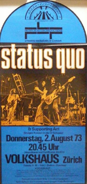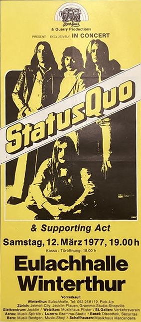 Status Quo et la Suisse ? Une grande histoire d'amour qui durera 56 longues années. En effet le premier des quatre-vingt treize concerts que le groupe donnera dans la péninsule helvétique se déroulera, à Neuchâtel, le 7 juillet 1968 et le dernier, le 8 août 2024, à Schaffhausen. Entre les deux, quatre-vingt onze dates à succès, notamment les représentations à Zurich où Status Quo attirera, régulièrement plus de 10.000 personnes. Les ventes de disques ne seront pas en reste avec pas moins de 22 singles classés parmi les meilleurs ventes de 45 tours ou encore 36 albums classés (12 seront certifiés or ou platine). Carrière parfaitement réussie.
